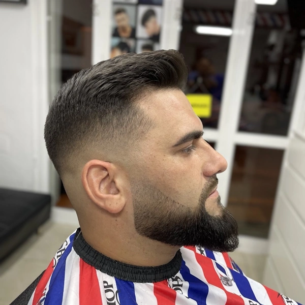 El equilibrio perfecto entre clasicismo y virilidad. Un peinado lateral tradicional que fluye hacia una barba completa, esculpida y degradada cuidadosamente para lograr una mandíbula marcada y potente.