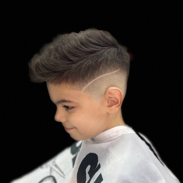 ¡Los pequeños también tienen estilo! Un corte fresco y cómodo con mucha textura en la parte superior y un «hair tattoo» (línea de diseño) curva que le da una personalidad única y divertida.