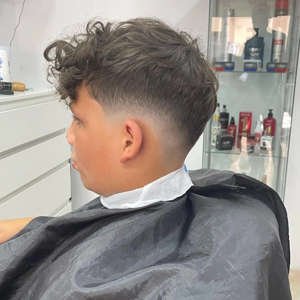 Especialistas en cabello rizado. Este corte respeta y potencia la caída natural de los rizos arriba, limpiando los contornos con un desvanecido sutil (Taper) para mantener un estilo juvenil y urbano sin perder la esencia del cabello.